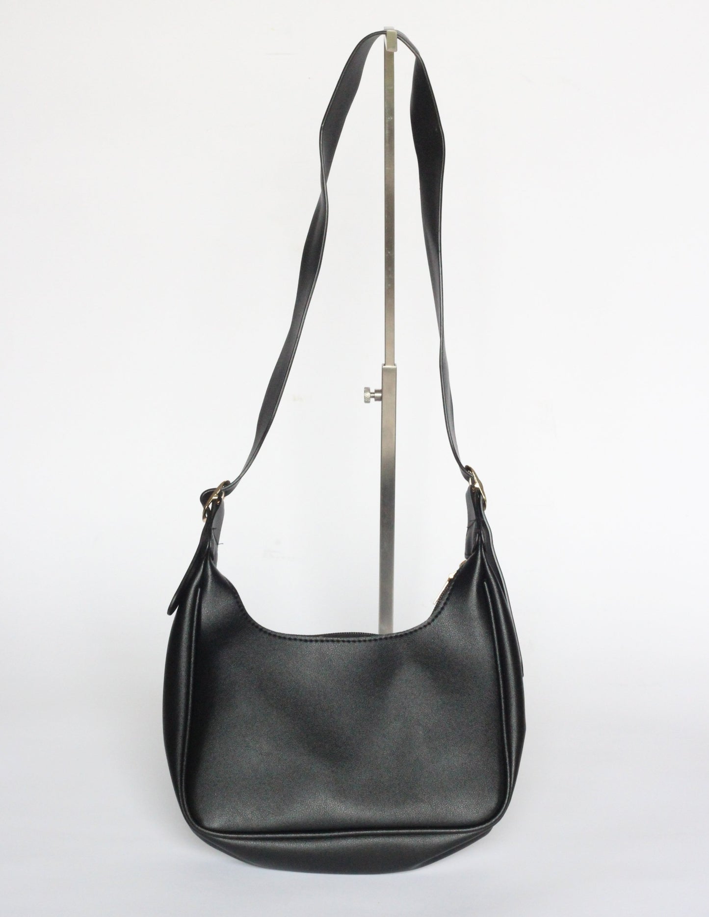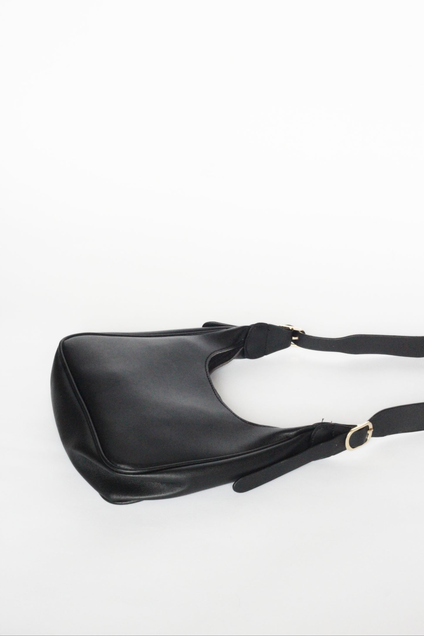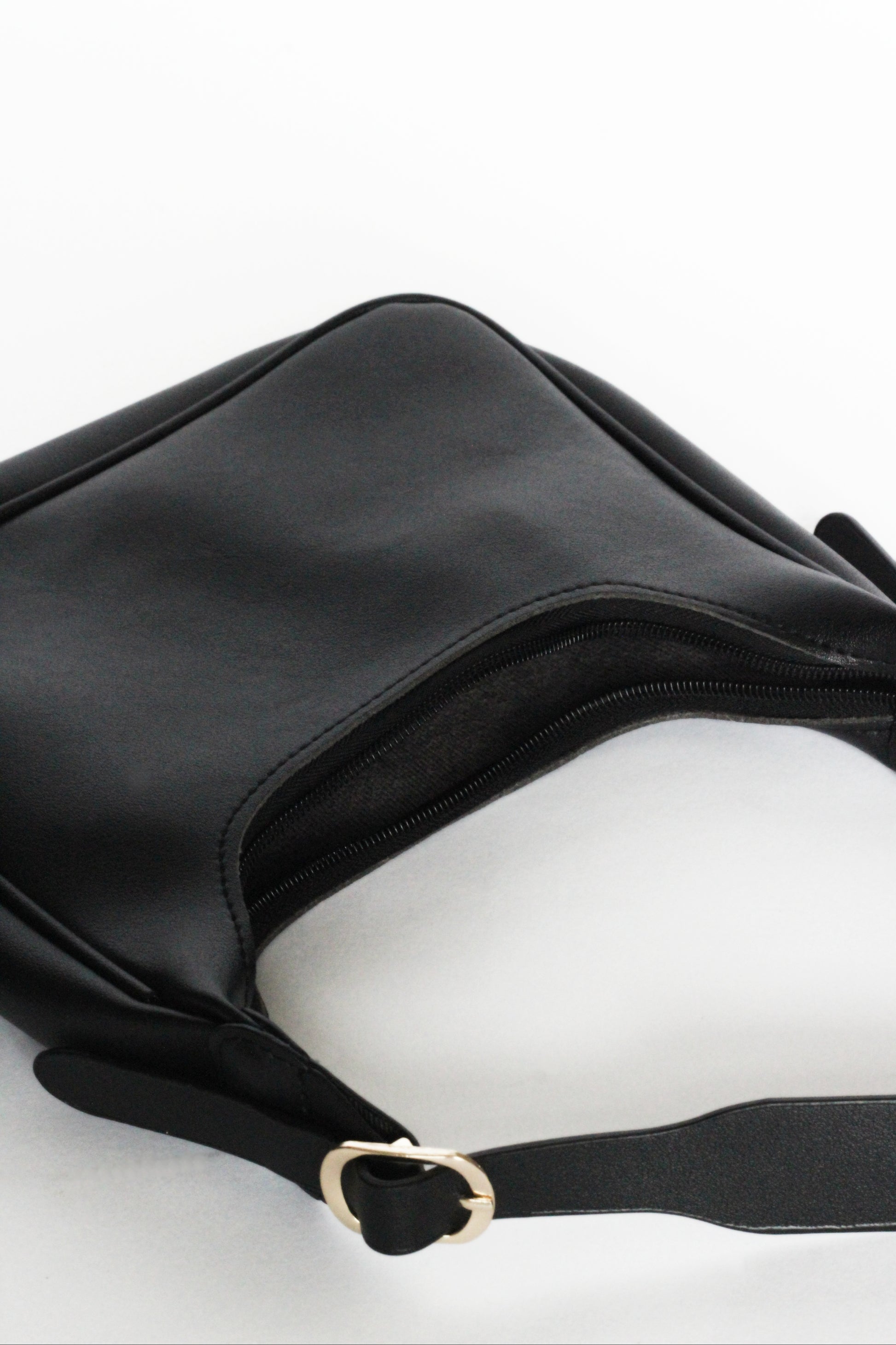 The ARIA bag is a classic design made from the softest black up-cycled faux leather. It sits perfectly on the shoulder, making it lightweight and easy to carry with the adjustable strap. It is also designed with a zipped fastening to keep belongings secure. The clasp details are gold for extra detail.