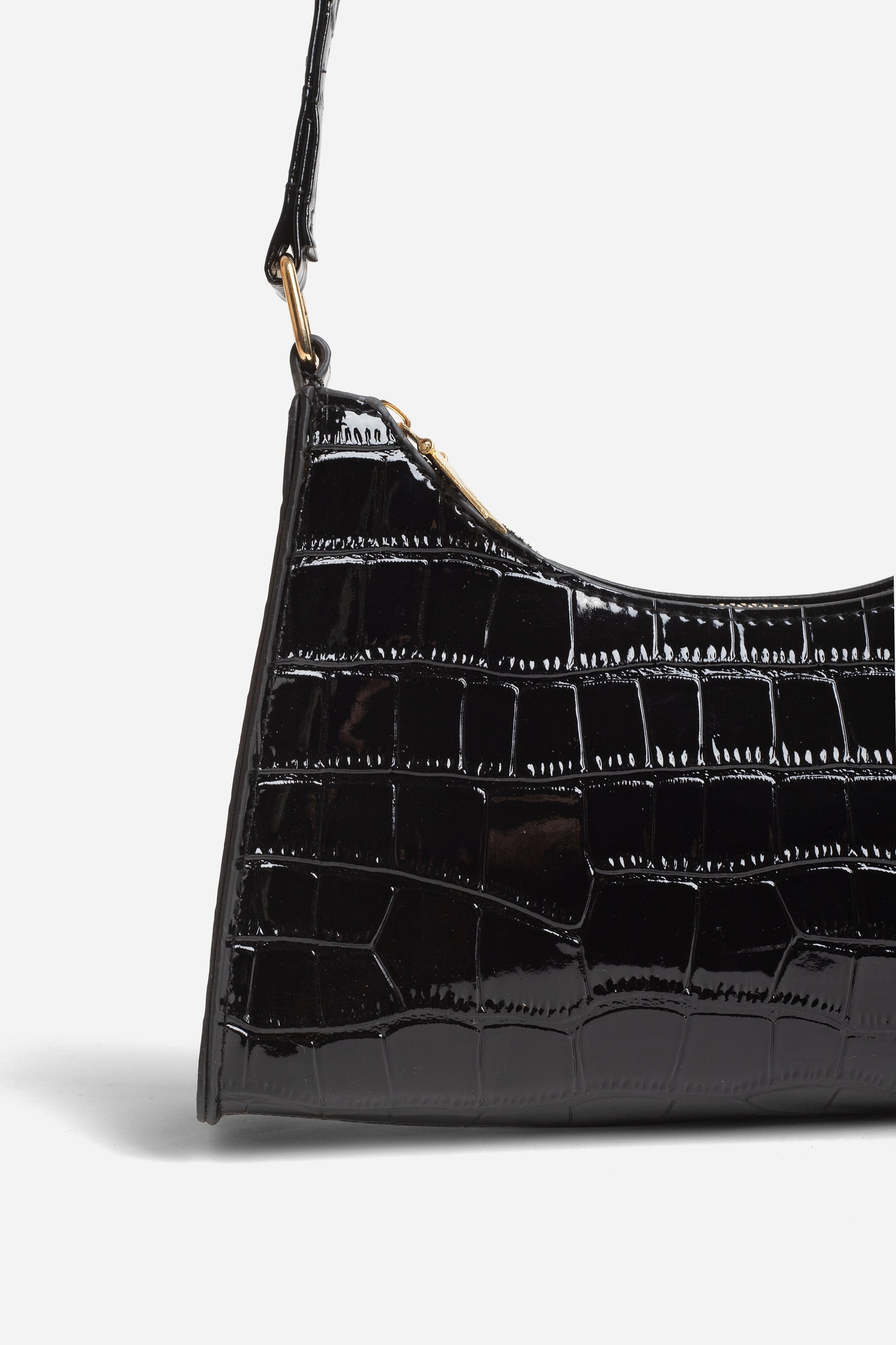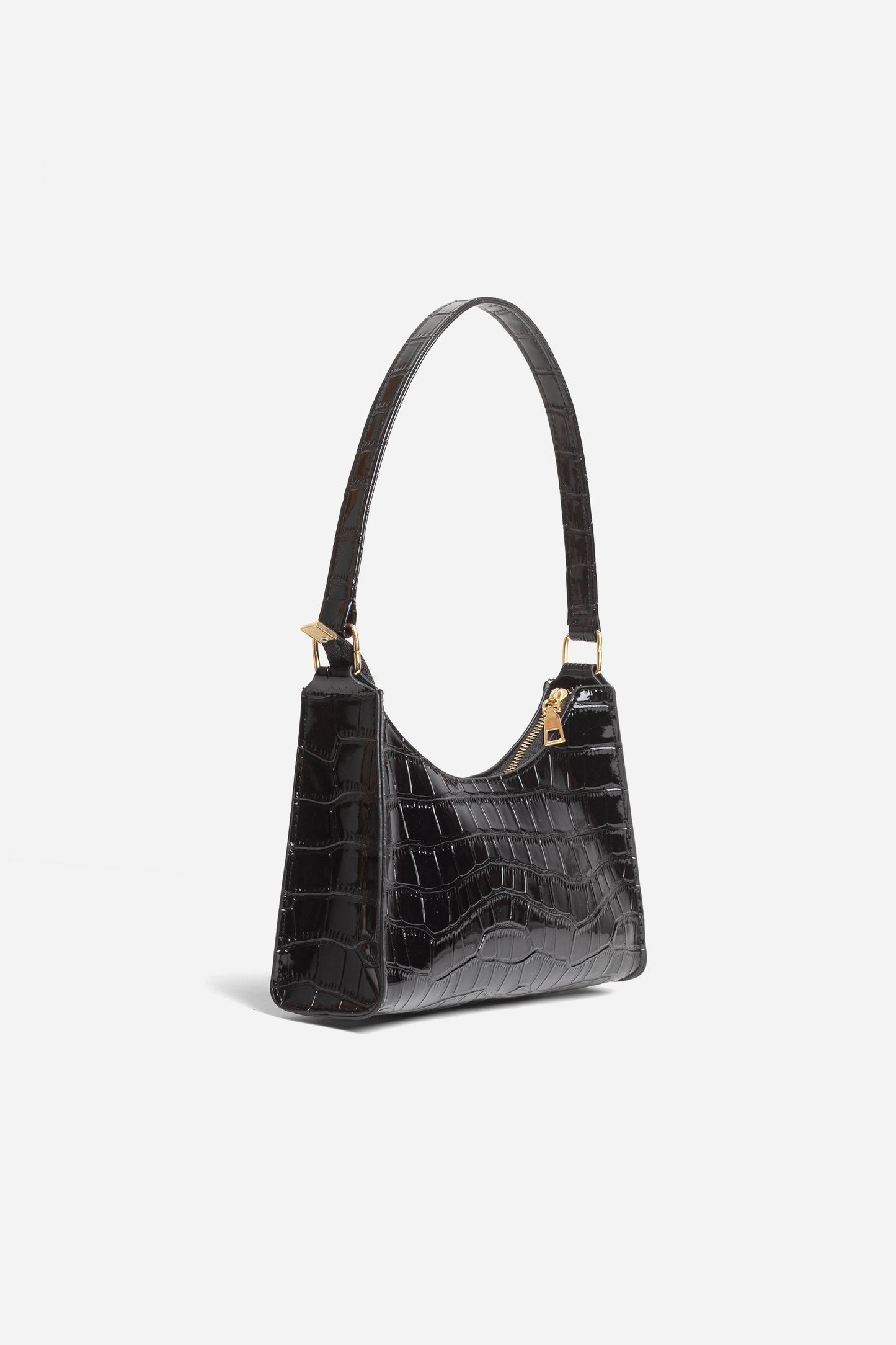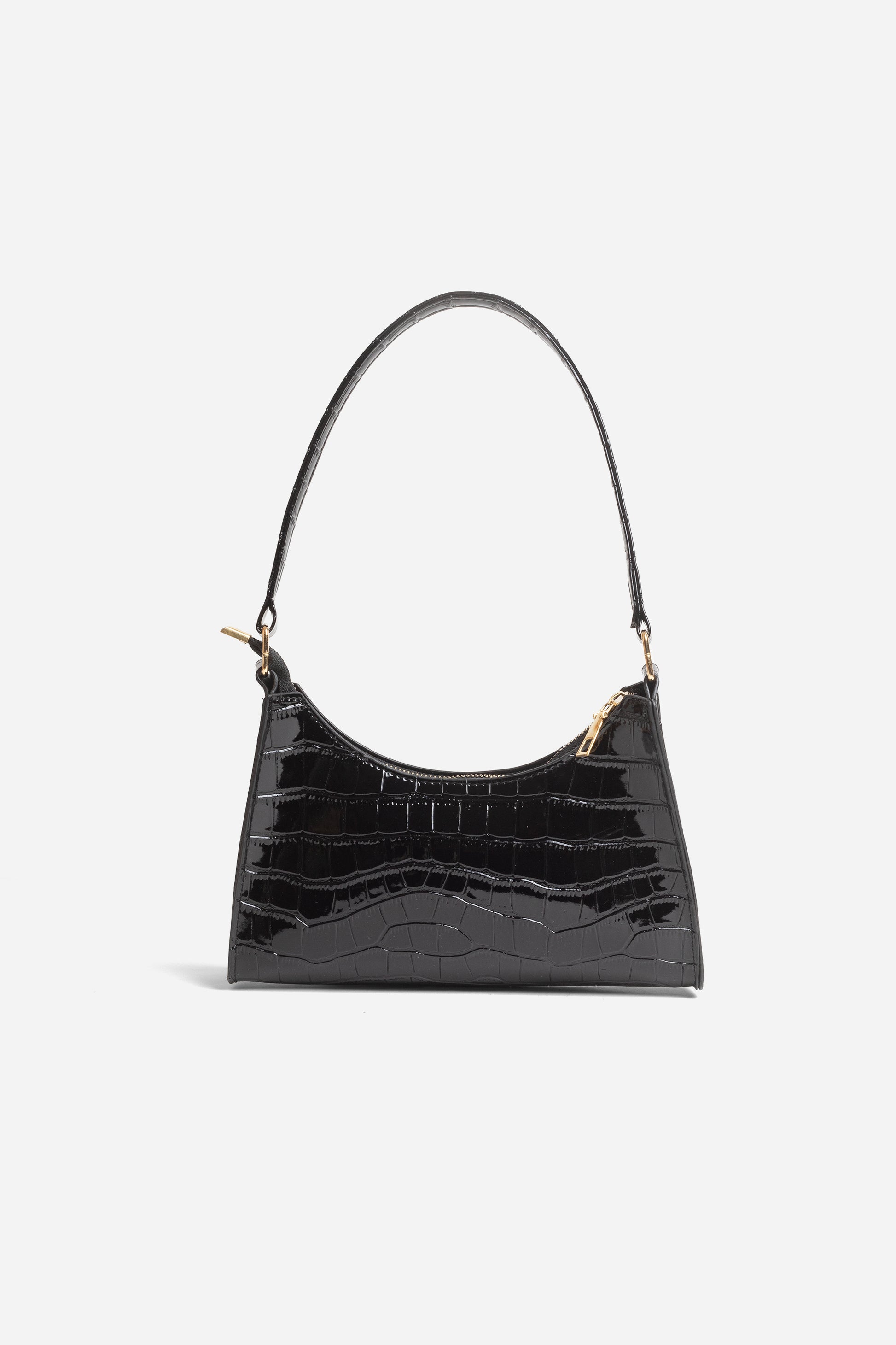 The LUCIA black mini bag is a classic design made from shiny faux croc leather. It sits perfectly on the shoulder, making it lightweight and easy to carry. The buckle details and zipper fastening are a contrasting gold tone.